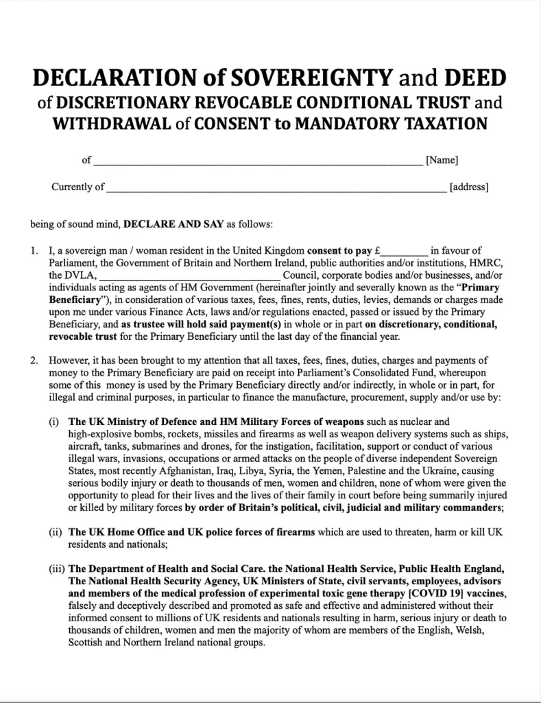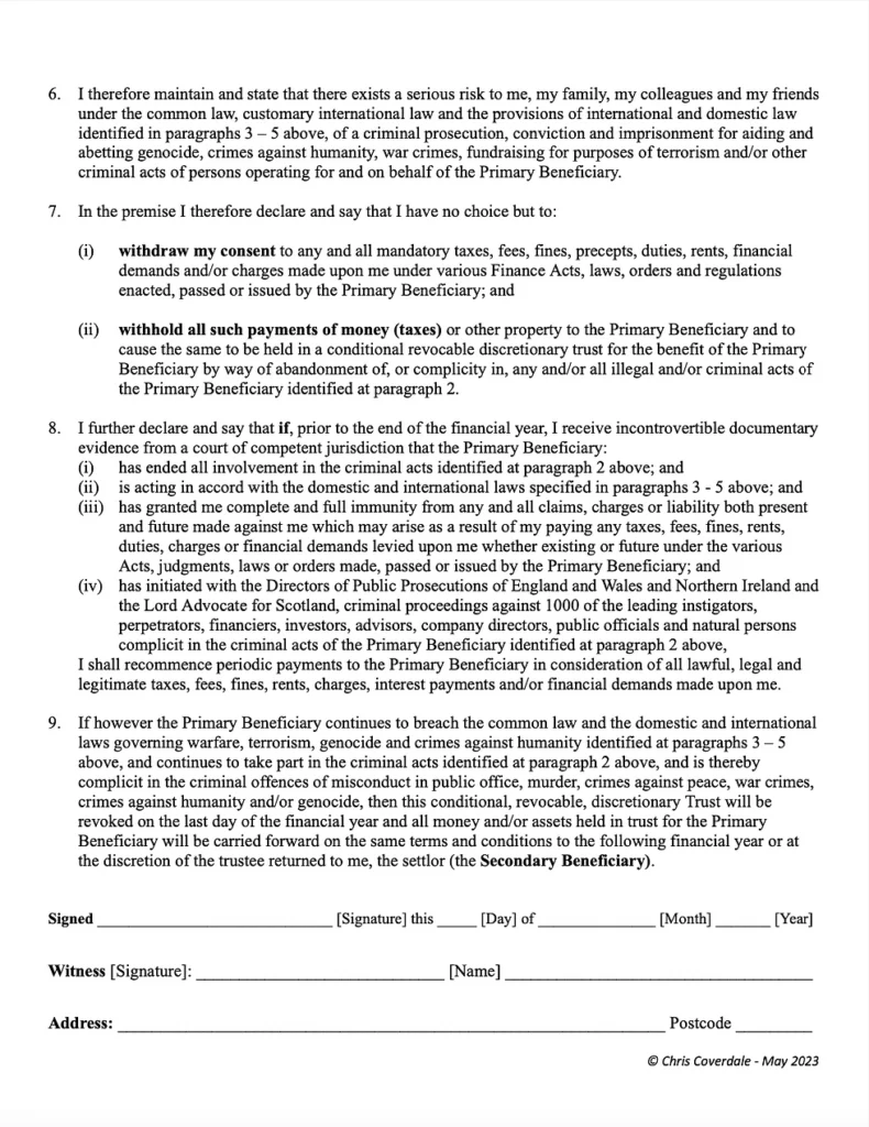On 5/4/24 you need to check whether the Government has met your conditions. If it has then start paying the taxes. If it hasn’t, then write to HMRC and the Council formally revoking their right to claim any back taxes from you and set up a new Declaration and Deed of Conditional Trust for the year ahead. But make sure you never again send them any money in lieu of taxes. Because if you do you will be committing a criminal offence under sections 15 and 17 of the Terrorism Act 2000 and section 52 of the International Criminal Court Act 2001 and if found guilty you could be sent to prison for 14 or 30 years respectively.