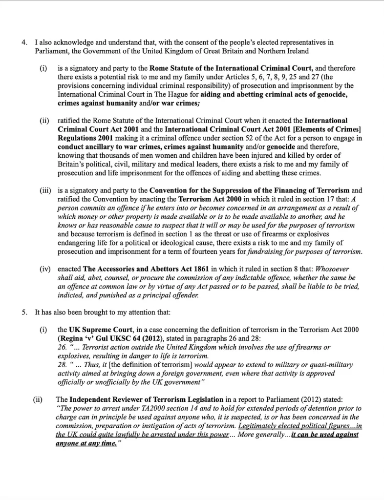 - If on the last day of the financial year the trustees find that the is continuing to breach the domestic and international laws governing warfare, terrorism, genocide and/or crimes against humanity identified at paragraphs 6 – 17 above, and is continuing to take part in the criminal acts identified at paragraphs 2, 3, 4 and 18 above, and is thereby complicit in the criminal offences of murder, misconduct in public office, misfeasance, crimes against peace, war crimes, crimes against humanity and/or genocide, then they are required to revoke this Trust and to return the PAYE and NI contributions plus employers NI contributions to their employees (the Secondary Beneficiary).